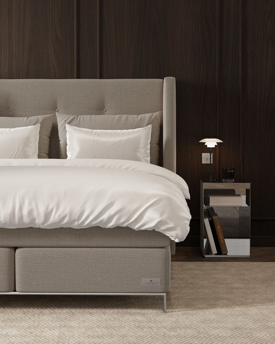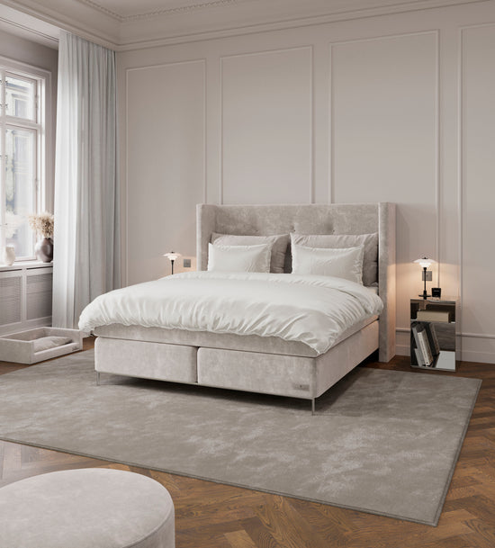 Reduced price on Sandö continental bed with Luxury mattress topper in our Cliff light grey fabric.